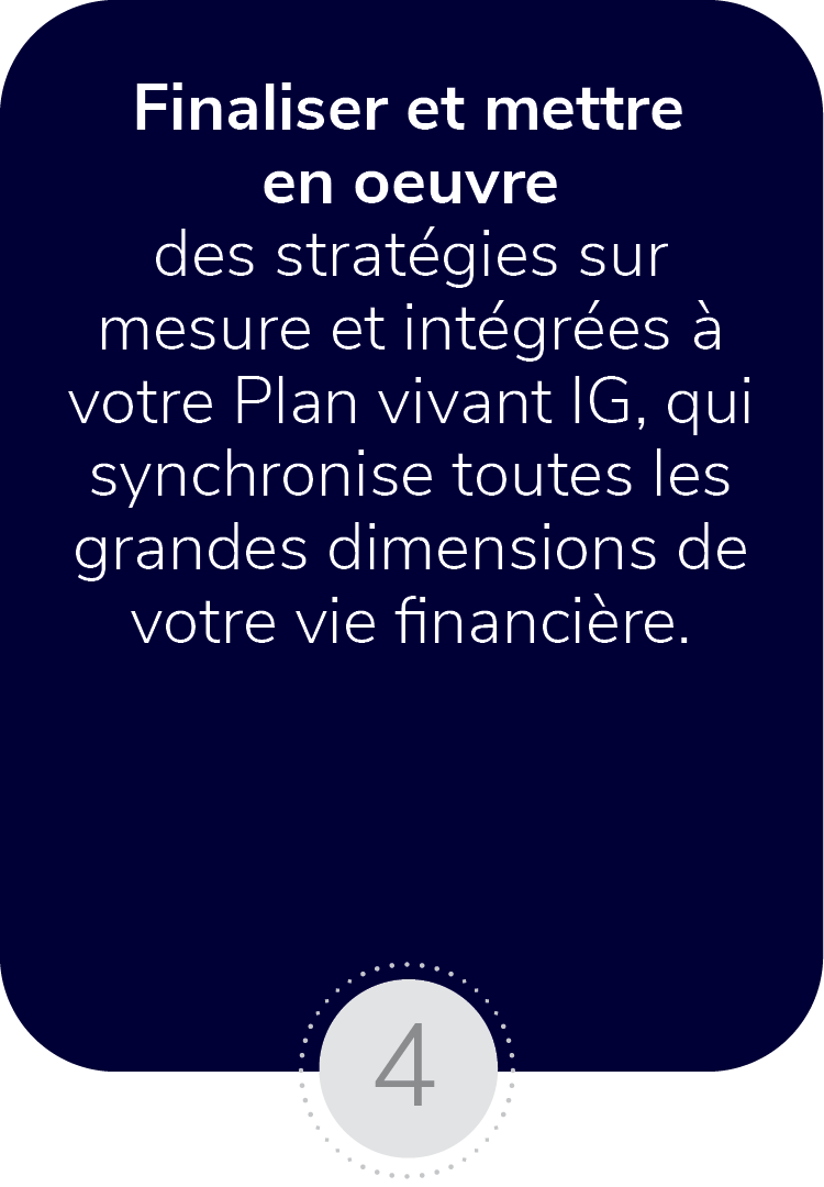 Faites l’essai de notre outil Aperçu IG pour en avoir une idée. Répondez à une série de questions reposant sur cinq dimensions du bien-être financier – optimiser votre retraite, vous préparer aux imprévus, partager votre patrimoine, gérer vos liquidités et planifier des dépenses importantes. Votre résultat sur une échelle de 100 points ainsi que des recommandations personnalisées pourront ensuite être utilisés pour établir un plan financier complet adapté à vos besoins.